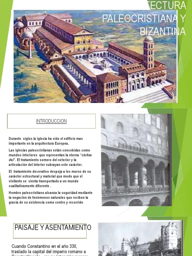 La arquitectura bizantina recibió, sobre una base formada esencialmente por la arquitectura romana, fuertes influencias de otros estilos arquitectónicos,.. Las edificaciones construidas por el imperio romano, se convirtieron luego en parte importante de la religión cristiana... Paleocristiana, donde se narran escenas del antiguo y nuevo testamento.